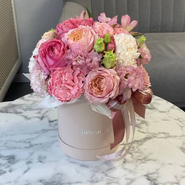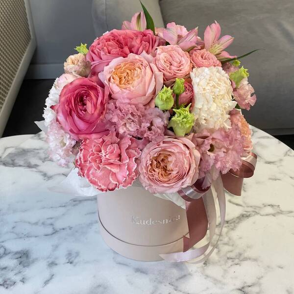 Состав: роза пионовидная кустовая, эустома, гвоздика, альстромерия, одноголовая пионовидная роза, авторская упаковка.