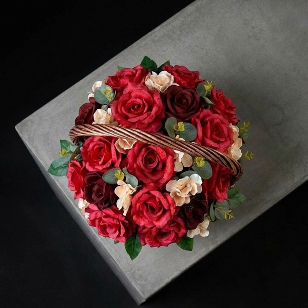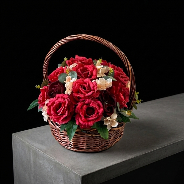 Траурная корзина из искусственных цветов в алых оттенках на Радоницу с утяжелением. Ширина корзины 40 см. Высота корзина 40 см с ручкой.