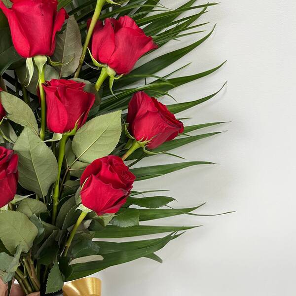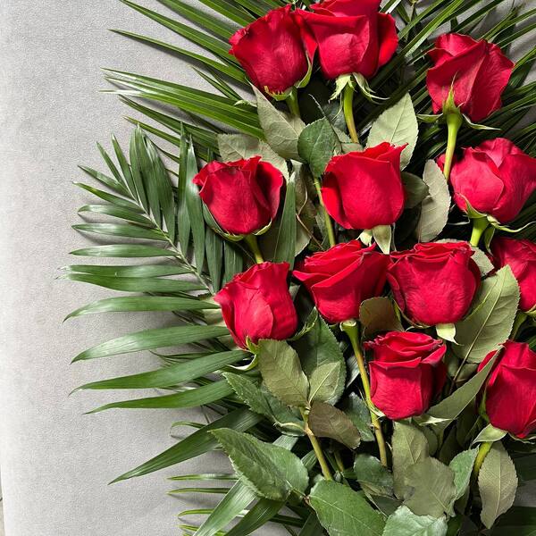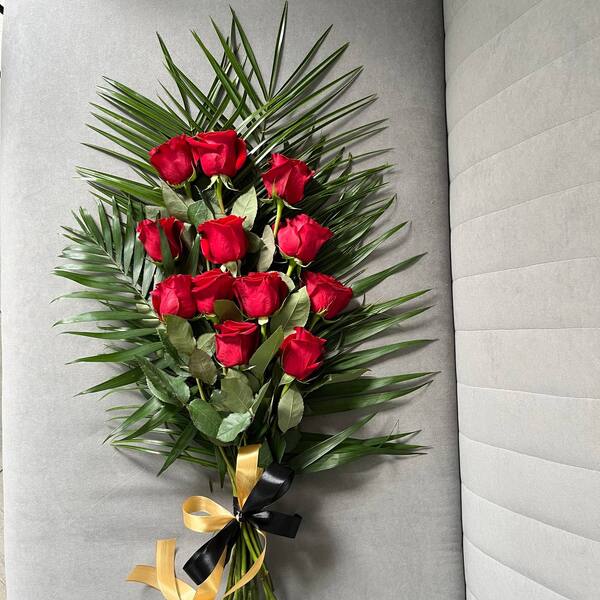 Ритуальный букет из роз. В составе красные розы 12 штук, зелень, траурная лента.